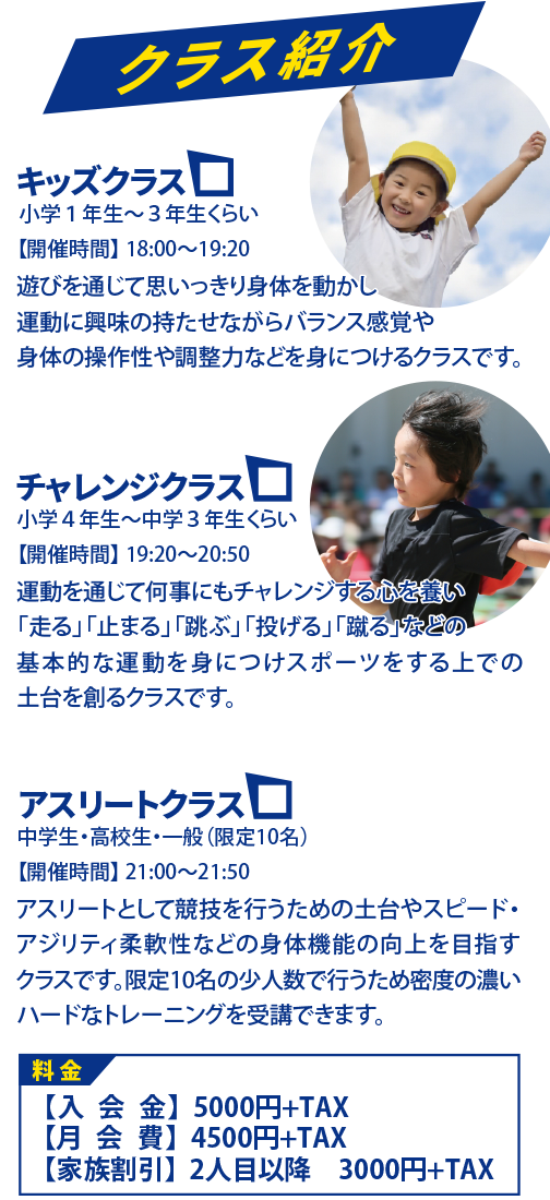 ABILITYでは人間の身体構造や神経系の機能を考慮し色々な動きを織り交ぜた運動をすることにより、子供の動作の引き出しを増やし、運動神経の向上やケガを予防します。