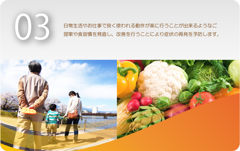 当院では患者様一人一人の症状を的確に判断し、その症状を引き起こす『原因』に対してトコトン考えます。手技療法、鍼灸治療、ウォーキング指導、骨盤矯正、テーピング療法、その他さまざま手技を用いて症状の改善を図ります。
